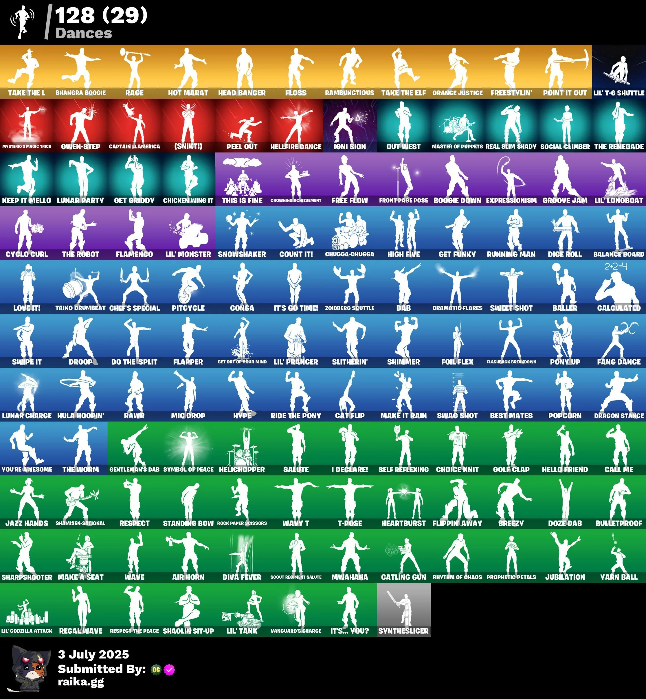(SnikT!), 100 DPS, 18's Kama, A.L.M., Abby Farmer Gun, Abominable Axe, Absenz, Abyssal Blade, Aero Mask Broken, Aftermath, Air Horn, All Night, All Smite, Angler Axes, Arc Flail, Arctic Recluse, Artifact Axe, Astrea, Axecalibur, Azuki, BB's Beast Bat, Backup Blades, Balance Board, Baller, Balloon Axe, Basic Basher, Batsickle, Battlehawk, Beast Boy, Beep 'B' Boop, Best Mates, Bhangra Boogie, Black Panther, Blackheart, Blacklight, Blackwrap Bat, Blades of Light, Blair, Bleam Beak, Blizzard's Bite, Blue Squire, Board Breaker, Boast Lord, Boba Fett, Bomb Bouquet, Bones, Boogie Down, Boulder Breakers, Breeze Blade, Breezy, Bubble Wands, Bulletproof, Bullset, Bury, C-Funk 03, Calamity, Calamity Marvel, Calculated, Call Me, Calper, Captain Llamerica, Carbide, Castor, Cat Flip, Catling Gun, Catrina, Chaos Director, Chef's Special, Chelsea, Chicken Wing It, Chill-Axe, Choice Knit, Chomp Jr., Chugga-Chugga, Clang & Basher, Cliffhanger, Cobalt, Code Cutter, Codecaver, Cold Buddy CSR, Conga, Count It!, Cozy Jones, Crescent Shroom, Crimson Polestar, Crimson Sai, Crowbar, Crowning Achievement, Cube Assassin, Cube Edge, Cuddly Crusher, Cyclo Curl, D'Vark, DJ Yonder, Dab, Dahlia, Dark Axe, Dark Blessing, Dark Jonesy, Dark Red Card, Dark Red Knight, Dark Voyager, Dead Swarm, Deadpool, Dice Roll, Dire, Diva Fever, Do The Split, Doze Dab, Dragon Claws, Dragon Stance, Dragon's Claw, Dramatic Flares, Draven's Legacy, Droop, Dual, Dual Machietas, Dumbo, Dune Scooper, Durrr Tsusho, Dusk, Dutch, Elite Agent, Elroy, Endless Ned, Eva, Evie, Expressionism, Fable, Faculty Mentor, Fallen Frost, Fang Dance, Field Bot Buster, Fightsick, Filet Axe, Flamenco, Flapper, Flashback Breakdown, Flippin' Away, Floss, Flux Silvera, Foil Flex, Foxfire Edge, Free Flow, Free Rider, Freestylin', Front Page Pose, Frost Playmaker, Frostbite, Gale Force, Game Knight, Garrison Jones, Gassey Quinn, Gentleman's Dab, Geometrik, Geralt of Rivia, Get Funky, Get Griddy, Get Out Of Your Mind, Giddy-Up, Gilded Higorinta, Gilt Glaive, Gold Knight Legacy, Golden Daggers, Golf Clap, Gorilla Evolved, Gromp, Groove Jam, Guiding Glow, Gum Brawler, Gunman, Gwen-Step, Havdn, Havoc, Haze, Head Banger, Heart's Carver, Heartburst, Heartless, Helichopper, Hellfire Dance, Hello Friend, Hera, Hex-Kit Detector, High Five, Highwire, Hoff Gideon, Holiday Bonk, Holly Hatchets, Honey Hitters, Hot Marat, Hula Hoopin', Human Bill, Hunter's Reach, Huntress, Hybrid, Hype, I Declare!, Ice Scepter, Icicle, Igneous Blade, Igni Sign, Imani, Inheritor's Edge, Instigator, It's Go Time!, It's... You, Jade, Jazz Hands, Jo Dawin, John Cena, John The Red, Jubilation, K.A.R.E.N. with AI-X, Kahuna, Kaiju Cutter, Keep It Mello, Kendo, Killer Frost, Knight's Tragedy, Knightsnack, Krisabelle, Kyvarn Hawk, Lady of Crawls, Laminator, Light Blade, Lil Spurt, Lil' Godzilla Attack, Lil' Longboat, Lil' Monster, Lil' Prancer, Lil' T-6 Shuttle, Lil' Tank, Lizzie, LolliLopper, Lorenzo, Love It!, Love Ranger, Lovelorn, Lt. Evergreen, Lt. John Llama, Luc '63 Dogg, Lucha Slashers, Lug Axe, Lunar Charge, Lunar Glow, Lunar Party, Lynx, Major Margaret, Make A Seat, Make It Rain, Malletine Charger, Mandalorian, Manner Bashers, Mantis, Marigold, Mariposa, Master Of Puppets, Masterpiece, Mean Streak, Medaxe, Mentor's Oath Badge, Mercurial, Mic Drop, Mina Park, Mission Specialist, Molten Max Axe, Momentum, Moonwalker, Mwahaha, Myha, Mysterio's Magic Trick, Mystestor, Mystica, Neko Claws, Nolan Chance, Nomad's Spear, Nun Bay Bayajag, Nyan Claws, Nyanja, Ol' Chopper, Ol' Woody, Oldbeard, Omega, Omega Rock, Omni Sword, Onesie, Onslaught, Orange Justice, Out West, Overtaker, Ozzy Hawk, Peel Out, Peely, Peppermint Pick, Photonos Striker, Pink Flamingo, Piper Race, Pitcycle, Plasprobe Claws, Point It Out, Poki 6, Polar Peely, Pony Up, Popcorn, Positron, Powder, Premier Domes, Prickly Axe, Prince Orion, Princess Lexa, Prophetic Petals, Pulse Axe, Punch Sai, Rabbit Raider, Rage, Rambunctious, Rank Shots, Raptor, Rav Chan, Rave Digger, Raven Team DDS, Rawr, Real, Real Slim Shady, Reaper, Rebellion's Paddles, Reckoning, Red Knight, Red Strike, Redline, Regal Wave, Renegade, Renegade LvlUp, Renegade Reaver, Renegade Rebel, Respect, Respect The Peace, Retrofuturist Guru, Reverie, Rhythm Of Chaos, Rian, Ride The Pony, Rift Edge, Rivers' Drama Star, Rock Paper Scissors, Rocket Wrecker, Rogue Agent, Rose Glow, Rose Team Leader, Rosie vs Zombies, Royale Knight, Rugid Climbing, Running Man, Rust Lord, Salute, Samurai Electric, Sawtooth, Scarlet Spider, Scorcher, Scoundrel, Scout Regiment Salute, Scratchmark, Secret Scimitars, Seeker, Selene, Self Reflexing, Sgt. Winter, Shadow Midas, Shadow Token, Shamisen-Sational, Shanta, Shaolin Sit-Up, Sharpshooter, Shimmer, Shooting Starstaff, Sidewinder, Silver Sash Renegade, Sinister Glare, Skull Blade, Sledgecracker, Sledgehammer, Sleet Spike, Slitherin', Sludgehammer, Slurp Shadow, Smash Up, Snoop Dogg, Snowplower, Snowshaker, Social Climber, Southpaw, Sovereign Sabers, Sparkle Diva, Sparkle Specialist, Sparkling Star, Spectra Knight, Spectra Slasher, Spider-Man, Spikebat, Spiked Baton-Mace, Spiked Slashers, Spin-It Slicer, Squad Leader, Standing Bow, Starlit Sai, Stelligon, Stitched Slicer, Stormpaw Slicers, Stray, Street Blade, Styx, Sub Commander, Summerdusk, Sun Strider, Super Soldier, Svara, Swag Shot, Swag Smasher, Swamp Knight, Sweet Clementine, Sweet Shot, Swipe It, Sylvie, Symbol of Peace, Synchronious Sai, Syntheslicer, T-Pose, Taiko Drumbeat, Take The Elf, Take The L, Tank vs Reptile, Taskmaster, Tatsuo, Tech Axe, Tegan, Tempest vs Sludge, Tender Defender, The Admission Blade, The Crescent Orion, The Foundation, The Ice King, The Masterwork, The Reaper, The Renegade, The Robot, The Ruthless Claw, The Scarlet Out, The Shademaker, The Takedown, The Visitor, The Worm, This Is Fine, Thorin, Throwback Axe, Thudthumper, Thunder, Tinderizer, Top Doggo Kit, Trace, Tracy Trouble, Trailblazer, Tree Splitter, Trenkque, Triarch RX9, Trog, Trusty No. 2, Tsuki 2.0, Twisted Sci