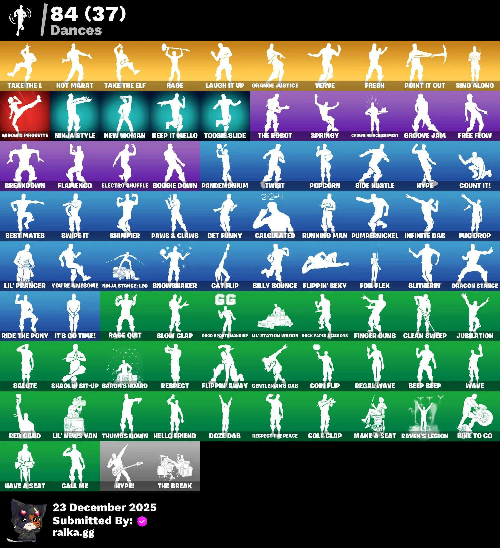 2020 Kickflip, Abominable Axe, Adventure Pack, Agent Peely, Airflow Vibes, Altitude, Apocalypse Shroud, Arctic Adeline, Arroyo Pack, Astro, Astro Jack, Astroworld, Astroworld Cyclone, Auto Clutch, B Splat, Back Board, Back-Mounted Turbo Tower, Balloon Axe, Bamboo-Tana, Banana Bomber, Banana Briefcase, Bananaxe, Banner Shield, Baron's Hoard, Base Jumper, Basecamp Bag, Basic Basher, Battlehawk, Beach Umbrella, Beachcomber, Bedside Nanner, Beep Beep, Best Mates, Big Haul, Bike To Go, Billy Bounce, Blackheart, Blinky Fugu Flail, Bobo, Bogey Bag, Bombs Away!, Boogie Down, Boulder Breakers, Bounty 'Brella, Breakdown, Brite Bag, Brite Gunner, Bullet Rider, Bunsen Backburner, Cactus Jack, Calamity, Calculated, Call Me, Carbide, Carbon, Cat Flip, Catalyst, Cazadora, Chani, Chani's Satchel, Chemist's Cloudglider, Chromebrella, Classified, Clawz Retro, Clean Sweep, Cliffside Soarer, Cobalt, Cobra, Coin Flip, Combat Wreath, Cometbrella, Comfy Cats, Competitor’s Time Brella, Conquest, Contract Giller, Count It!, Covered Crusader, Crossfire, Crowbar, Crowning Achievement, Cruiser, DJ Yonder, Dark Engine, Dark Matter, Dark Voyager, Deadpool, Deadpool's Katanas, Dealer's Deck, Desert Dawn Lyric, Dieselback Pack, Dire, Dorsal Destroyer, Downpour, Downshift, Doze Dab, Dragon Stance, Dragon's Claw, Dreamers Two-Shot, Drift, Dusk, Dusk Wings, Electric Shredder, Electro Pairing Blades, Electro Shuffle, Electro-Pincers, Elegant Crowbar, Elite Agent, Elite Servo, Enforcer, Epic Swords Of Wonder, Equalizer, Eva, FNCS Raider, Fa-La-La-Llama, Fable, Fabled Cape, Feline Fun, Finger Guns, Flamenco, Flippin' Away, Flippin' Sexy, Foil Flex, Founder's Glider, Founder's Umbrella, Fox Drifter, Free Flow, Fresh, Frozen Axe, Frozen Shroud, Gale Force, Gear Specialist Maya, Gentleman's Dab, Get Funky, Giddy-Up, Gilded Scepter, Gli-Dar 3000, Glidurrr, Glorious Giftblade, Gold Brutus, Gold Dagger Pack, Gold Midas, Golden King, Golf Clap, Good Sportsmanship, Goodie Bag, Grand Glacier Glider, Groove Jam, Grzzly Keys, Guiding Glow, Gwenpool's Katanas, Hack & Smash, Hadean Gate, Hanzo Katana, Har-Har-Har!, Have A Seat, Heart's Carver, Heartspan, Hello Friend, Hench Hauler, High Society Glider, Holiday Boxy, Homer's Gift, Hot Marat, Hot Pokers, Hunter's Stake & Hammer, Huntress, Hybrid, Hype, Hype!, Ice Cube, Ice Mantle, Ice Scepter, Infinite Dab, Intrepid, Iris, It's Go Time!, Jar Buster, Jubilation, Kabag!, Keep It Mello, Klassic Kombat Crasher, Laugh It Up, Lectro Guard Pack, Legend's Modkit, Legendary Blade Of Insight, Lil' Dilly, Lil' News Van, Lil' Prancer, Lil' Station Wagon, Llamacorn Express, Loaded Barrel Bag, Lollipopopper, Lone Wolf Holster, Lt. Evergreen, Lug Axe, Lunar Hyperjet, Lunar Skyspan, Lunarios, Lynx, Make A Seat, Marshy Smasher, Master Portal, Mean Streak, Meowscles, Mercurial, Mic Drop, Millennium Falcon, Mission Specialist, Molten Max Axe, Moonwalker, Mr. Daruma, Mutiny, Nana-Brella, Nanner Bashers, Neon Wings, New Woman, Night Cloak, Nightshade, Ninja Stance: Leo, Ninja Style, Nog Ops, Nyanja's Catpak, O.X.R Holo-Slate, O.X.R. Ranker, Offworld Rig, Ol' Woody, Ollie, Omega, Onesie, Onslaught, Orange Justice, Outlaw's Knife Rack, Outlaw's Whipknives, Paddle Bass, Padlock, Panda Parade, Pandemonium, Paper Parasol, Paws & Claws, Peely Whip, Peppermint Pick, Perfect Pivot, Perfect Present, Permafrost, Picnic, Piñata Brian, Plexi-Plastic Axe, Plunja, Point It Out, Pool Party, Pop Axe, Popcorn, Positron, Powder, Precision, Premiere Poms, Prized Llama, Psionic Surfer, Pumpernickel, Punk Powerglider, Pursuit, R3X Tail, Rage, Rage Quit, Ragnarok, Rainbow Rider, Ranker's Tags, Raptor, Raptor Satchel, Raven's Legion, Re-Gifter, Rearguard, Rebel Brella, Rebel's Rucksack, Reckoning, Red Card, Redline, Redline Scout, Redmask Ranker, Regal Wave, Reinforced Backplate, Rescue Board, Respect, Respect The Peace, Rickety Runner, Ride The Pony, Rift Edge, Riftbreaker's Edge, Ritual Longhorn, Rock Paper Scissors, Rogue Agent, Rook, Rose Glow, Rose Light Daggers, Rose Rider, Rose Team Leader, Roundabout, Royale Air, Ruby Relic, Running Man, Runway Racer, Rust Bucket, Rust Lord, SC Electric, Safety Inspector 'Brella, Salute, Sawtooth, Scales Of Justice, Scorcher, Scratchmark, Sea Bobber, Secret Scimitars, Sgt. Winter, Shadow Stalker, Shamisen Electric, Shaolin Sit-Up, Shattered Halo Ring, Shimmer, Shooting Starstaff, Shortbread Slicers, Side Hustle, Sidewinder, Sing Along, Skellefish, Skirmish, Skull Ranger, Skullder, Sky Serpents, Skye, Sled Ready Guff, Sledgecracker, Sledgehammer, Slitherin', Slow Clap, Smash O'-Lantern, Smash Up, Snowfall, Snowshaker, Society Shield, Solid Scratch, Sonic Splash, Specialist Pickaxe, Spectra Protector, Splashdown, Springy, Sprite Plushie, Squad Leader, Standard Issue, Steel Shadow, Sub-Zero's Battle Axes, Subjugator, Sugar Crash, Summit Striker, Sun Sprout, Sun Strider, Swag Bag, Swag Smasher, Swarm, Swipe It, Tactical Sleigh, Take The Elf, Take The L, Tank Cannons, Teknique, The Ace, The Axe Of Champions, The Axe Of Champions 2.0, The Break, The Ice King, The Kuro Kabuto, The Mcg, The Olympian, The Prisoner, The Reaper, The Rebel, The Rezzbrella, The Robot, The Sith, The Takedown, The Umbrella, The Visitor, Thumbs Down, Tie Whisper, Time Brella, Tnteeth, Tntina, Tomoki & Katana, Toosie Slide, Top Notch, Trail Tote, Travis Scott, Treefall, Trickster's Shield, Trog, Trusty No. 2, Twist, Uplink, Valor, Verve, Visual's Glider, Warpaint, Wave, Waveform, Webrella, Wet Paint, Whiplash, Widow's Pirouette, Wild Blast, Wild Streak, Wingman, Wings of Valor, Winterfest Bushranger, Wintry Whirligig, Wolfpack, Wooly Warrior, You're Awesome, Yuki Yubari, Zadie's Blade, Zenith, Zoey, Zoomie Groove