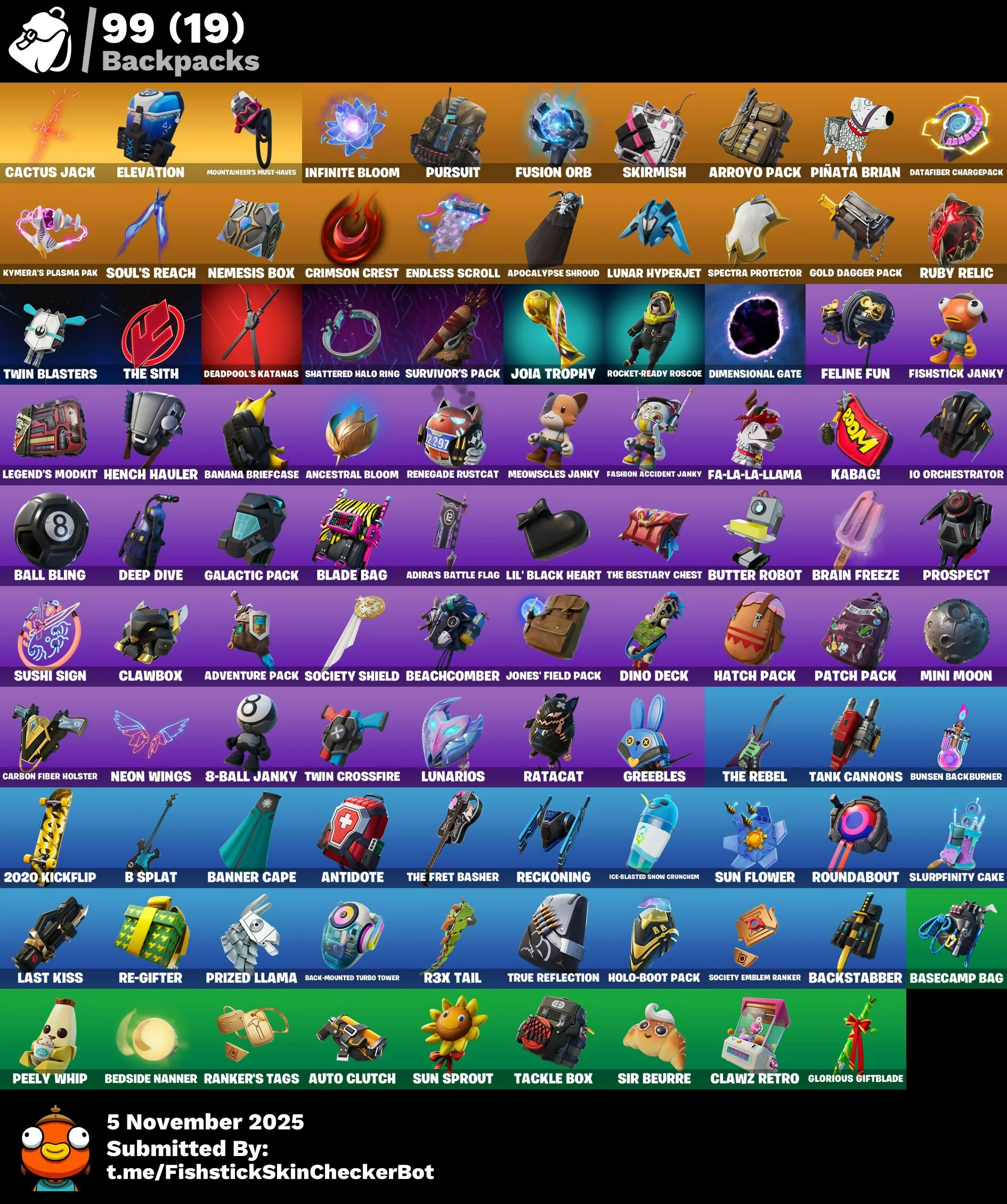 2020 Kickflip, 8-Ball, 8-Ball Janky, 8-Ball Vs Scratch, A.L.T.E.R., Abduction, Acolyte's Curse, Adira's Armor, Adira's Battle Flag, Adventure Pack, Aerial, Aerial Acrobat, Afterparty, Agent Jones, Agent Jones (Jump 31), Agent Nana, Agent Peely, Air Shredder, Amplitude, Ancestral Bloom, Angler Axes, Anniversary Axe, Antidote, Apocalypse Shroud, Aquaman, Aquaman's Trident, Arctic Adeline, Arroyo Pack, Astro Antidote, Astro Jack, Astroworld Cyclone, Auntie Dot, Aura, Auto Clutch, Axe-tral Form, Azarath Metrion Zinthos!, B Splat, B.R.U.T.E. Competitor, Backstabber, Ball Bling, Bamboo-tana, Banana Bomber, Banana Briefcase, Bananaxe, Bank Shots, Banner, Banner Cape, Banner Icon, Base Jumper, Basecamp Bag, Basic Basher, Battle Bloom, Battle Mode, Bawk Off, Beachcomber, Beacon Trance, Beamers, Bean Bag, Beast Boy & Raven, Bedside Nanner, Beef Blade, Beep Beep, Bees!, Belt It!, Big Fan, Big Haul, Bike To Go, Billy Bounce, Birdie, Blade Bag, Blade of the Waning Moon, Blasted, Blizzard Bomber, Blocko, Blue Shock, Blue Viper, Boing!, Bombs Away!, Bone Patrol, Boogie Down, Boots N' Cats, Bootstraps, Both Eyes Open, Boulder Breakers, Bouncer, Bounty 'Brella, Bracer, Brain Freeze, Breathless Blades, Brella, Bronzed Scimitars, Brutus, Bunsen Backburner, Burning Ambition Valeria, Burning Dragon, Bushie Bright, Butter Robot, Buttoned Up, Bytes' Sigil, Cactus Jack, Calico, Call Me, Cameo, Cameo Vs Chic, Carbon Fiber Holster, Card Drop, Cardistry, Cash Grab, Chainsaur, Charlotte's Logo, Chew Toy, Chic, Chimpanski Wants You, Chop Chop, Chop Dropper, Choppy, Chrome Marked, Classified, Clawbox, Clawz Retro, Clean Sweep, Cloud Llama Board, Cloud Striker, Cluck, Cluck (Slurpy), Clucking Mad, Cobalt Overdrive, Coin Flip, Combat Giller, Comet, Comfy Cats, Competitor's Time Brella, Constructor, Convergence, Corrupted, Cosmic Sun, Courageous Mikasa, Cowboy Chat, Crabby King, Crazy Eight, Crimson Crest, Crowning Achievement, Crunk Bunny, Crystal, Crystal Axe of the Masters, Cube Marking, Cubed, Cuddly Cloudcruiser, Cymitar, D.C. 63, Datafire Chargepack, Daughter Of Trigon, Deadpool, Deadpool's Katanas, Dealer's Deck, Deep Dive, Demons Beware, Denim Destiny, Determined Renegade, Diamond Shapes, Diamond Throne, Diamondclaw Picker, Dimensional Gate, Dino Deck, Dive Knives, Do The Split, Doctor Slone, Doggo, Dolphin, Downpour, Doze Dab, Dragon Rune Lances, Dragon Spirit, Driver, Droop, Droopy, Dropout, Drummies, Duelist's Foil, Durrr Burger, Dynamite, E.G.O., Echo, Eggar, Electro Pairing Blades, Elevation, Elite Servo, Ember Pick, Enchanted Lifebloom, Endless Scroll, Eon Blades, Epic Swords of Wonder, Evasive Maneuvers, Everything's Fine, Explorer Emilie, Fa-La-La-Llama, Fade, Fade Out, Fancy Peter Griffin, Fashion Accident Janky, Feline Fun, Final Harbinger, Fish Hook, Fishbone, Fishstick Janky, Fishy Flier, Fixer, Flapjack Flyer, Flashback Breakdown, Flippin' Away, Foil Flex, Fortilla Flier, Foundational 'Brella, Founder's Glider, Founder's Umbrella, Fox Clan 'Brella, Frostburn, Fryangles, Fusion, Fusion Coil, Fusion Orb, Fusion Scythe, Galactic Pack, Gear Specialist Maya, Gila Classic, Gilded Scepter, Glorious Giftblade, Glyph Master, Go Gnome!, Gold Dagger Pack, Gold Touch, Golden Agent, Golden King, Golden Shine, Grand Glacier Glider, Grav-Fusion, Greebles, Greed, Gringle Gift, Grriz, Guggi Was Here, Guggimon, Gugmon, Hack & Smash, Hammerhead, Hammerhead Morty, Hang Loose Celebration, Har-Har-Har!, Harbinger Armor Omegarok, Harbinger Of Victory, Harley Hitter, Hat - Dark, Hatch Pack, Haute Hustle, Haven, Head Banger, Heart Sign, Heart's Desire, Heavy Metal Omega, Hench, Hench Hauler, Hidden Haven, High Five, High Society Glider, Highlight Strikers, Holiday Boxy, Holo-Boot Pack, Homebase Banner, Honey Scepter, Hope, Hope's Look, Hot Pokers, Hula Hoopin', Hunter's Crest, Hydraulic Wrecker, I Believe, I Declare!, I'm A Mystery, I'm Ready!, IO Eradicator, IO Orchestrator, Ice Breaker, Ice Intercept, Ice-Blasted Snow Crunchm, Icy Pop, Idol Lights, Imagined Edge, Imagined Order, Industrious, Infinite Bloom, Ink Wolf, Inside Out, Interstellar Rick, Introducing... Raise The Cup, Invasion, Io Field Flyer, Io Stealth Sail, Iris, Jaguar Strike, Je Suis Montague, Joey, Joia Trophy, Jones Underground, Jones' Field Pack, Josie, Journey, Journey Vs Hazard, Jules, Jules' Mask, Jurassically Charged, Just Desserts, Kabag!, Kablammo!, Kaboom!, Kal-El's Cape, Kenshi Yonezu, Keyed Up, Kick Back, Kit, Kittanas, Knife Sharpener, Knight's Helm, Knight's Honor, Knight's Treachery, Kymera, Kymera Swarm, L, Lara Croft, Lara Croft (Gold Anniversary), Laser Blaze, Laser Pick, Last Kiss, Lazer Blast, Legend's Modkit, Legend's Retribution, Lewis Hamilton, Lil Split, Lil' Black Heart, Lil' Longboat, Lil' Monster, Lil' Prancer, Lil' Saucer, Lil' Treat, Lllamacorn Express, Lloose Cannon, Lock It Up, Lotus Touch, Love, Love It!, Lt. Evergreen, Lunar Charge, Lunar Hyperjet, Lunar Skyspan, Lunarian Luxury, Lunarios, Mad Mask, Marshmallets, Mask Off, Masked Scuba Jonesy, Master Engineer, Mayhem, Mean Streak, Mecha Fish, Mecha Wrecks, Medaxe, Mega-Brella, Meow Skulls, Meowabunga!, Meowscles, Meowscles Janky, Meowstermind, Merc, Mercurial, Metalmark, Meteors, Midas Memory, Mighty Marvel 'Brella, Mighty Tree, Millennium Falcon, Mini Moon, Missing: Peely, Monks, Monstrous Hunger, Montague, Mr. Dappermint, Multiplayer, Mushroom, Mysterious Fate, Nailed It, Nanner Bashers, Naughty Or Nice?, Needle Dropper, Nemesis Box, Neon Wings, New Year 2020, Neymar Jr, Neymar Jr (Exhibition), Neymar Jr., Ninja, Nisha, Nomad's Treasure, Ocean, Ocean Wave, Ohm, Ol' Woody, Ollie, Omegarok, Omegarok Grin, Oni Mask, Oozey, Oscar, Oscar's Roar, Out West, Outlander, Outlaw's Whipknives, Panda Parade, Pandemonium, Paradigm (Reality-659), Party Hips, Pastel, Patch Pack, Paw Mark, Paws & Claws, Peely Whip, Peppermint Pick, Perfect Pivot, Perfect Point, Peter Griffin, Petervision, Piercing Ace, Pink, Pirouette, Pizza, Piñata Brian, Planet, Planetary Vibe, Poacher's Regrets, Point P